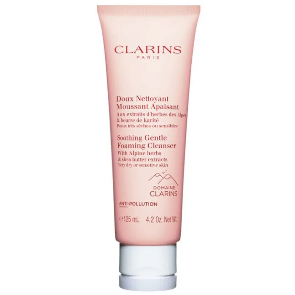 Clarins Soothing Gentle Foaming Cleanser is een zachte schuimreiniger voor de zeer droge of gevoelige huid. De crèmige textuur verandert in een zijdezacht schuim dat make-up, vuil en vervuiling effectief verwijdert zonder de huid uit te drogen. De formule is zeepvrij en verrijkt met biologische alpenkruiden, moringa-extract en plantaardige squaleen voor een schone, gekalmeerde en comfortabele huid na het reinigen.