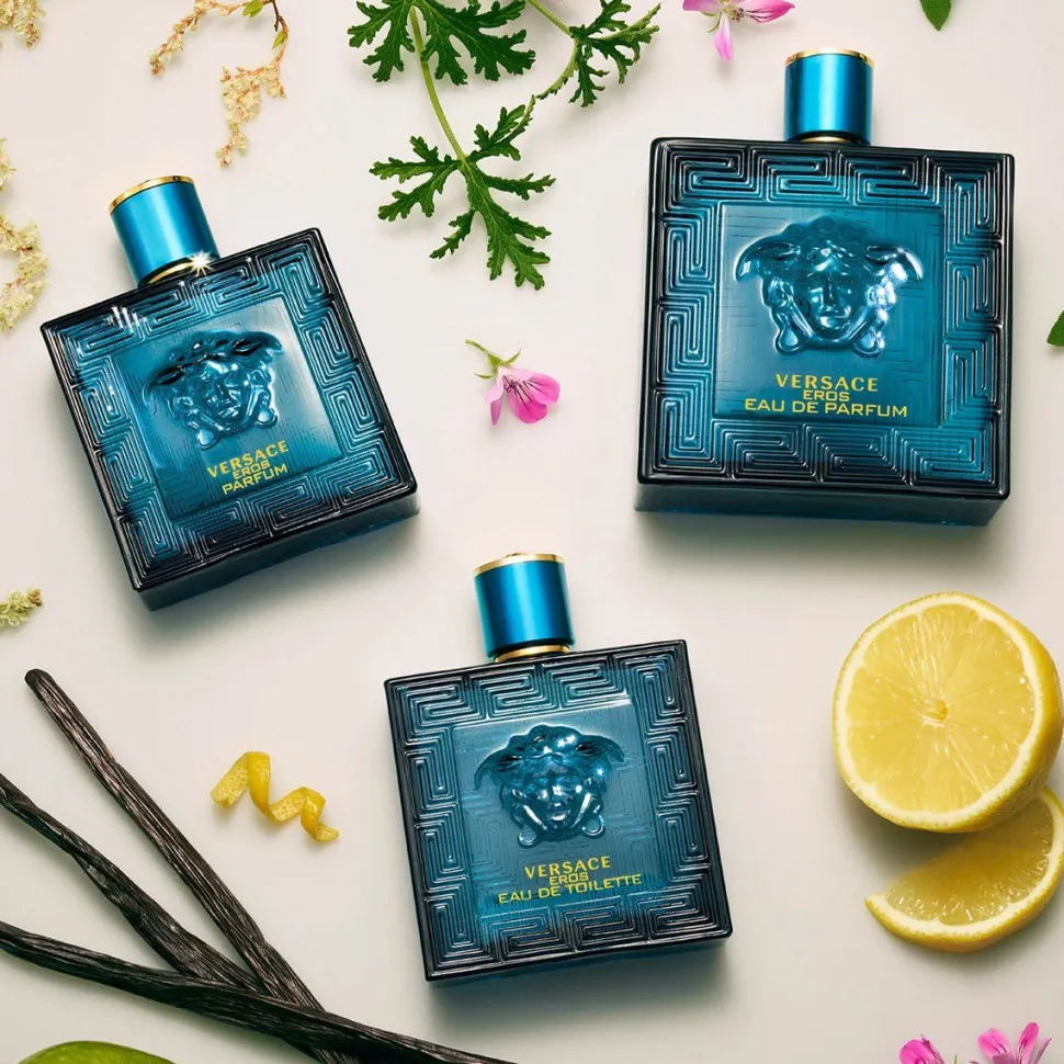 De kracht van Eros komt van de grootsheid van de Medusa die uit het midden van de flacon tevoorschijn komt, omgeven door het Griekse sleutelontwerp. Het ontwerp dat daarachter is ingelegd creëert een sterke visuele emotie. In het midden staat in goud gedrukt: VERSACE EROS PARFUM. Eros Parfum. De geur. Koele citrusvruchten sprankelen: mandarijn en citroen, met litsea cubeba.